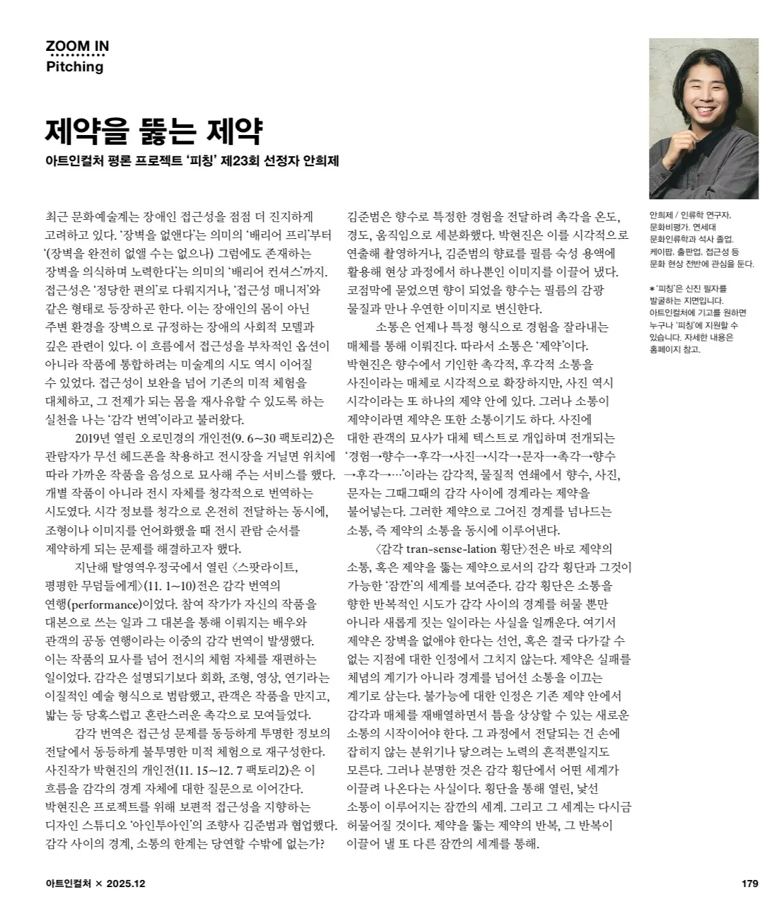 최근 문화예술계에서는 장애인 접근성이 점점 더 진지하게 고려되어 왔다. ‘장벽을 없앤다’는 의미의 ‘배리어 프리’부터 ‘그럼에도 존재하는 장벽을 의식하며 노력한다’는 의미의 ‘배리어 컨셔스’까지, 접근성은 ‘정당한 편의’나 ‘접근성 매니저’와 같은 형태로 등장했다. 이것은 장애인의 몸이 아닌 주변 환경을 ‘장벽’으로 규정하는 장애의 사회적 모델과 깊은 관련이 있다. 그런 흐름 안에서 접근성을 부차적인 옵션이 아니라 작품에 통합하려는 시도들 또한 이어질 수 있었다. 접근성이 보완을 넘어 기존의 미적 체험을 대체하고 그 전제가 되는 몸을 재사유할 수 있도록 하는 실천이 되는 과정을 나는 ‘감각 번역’이라고 불렀다.